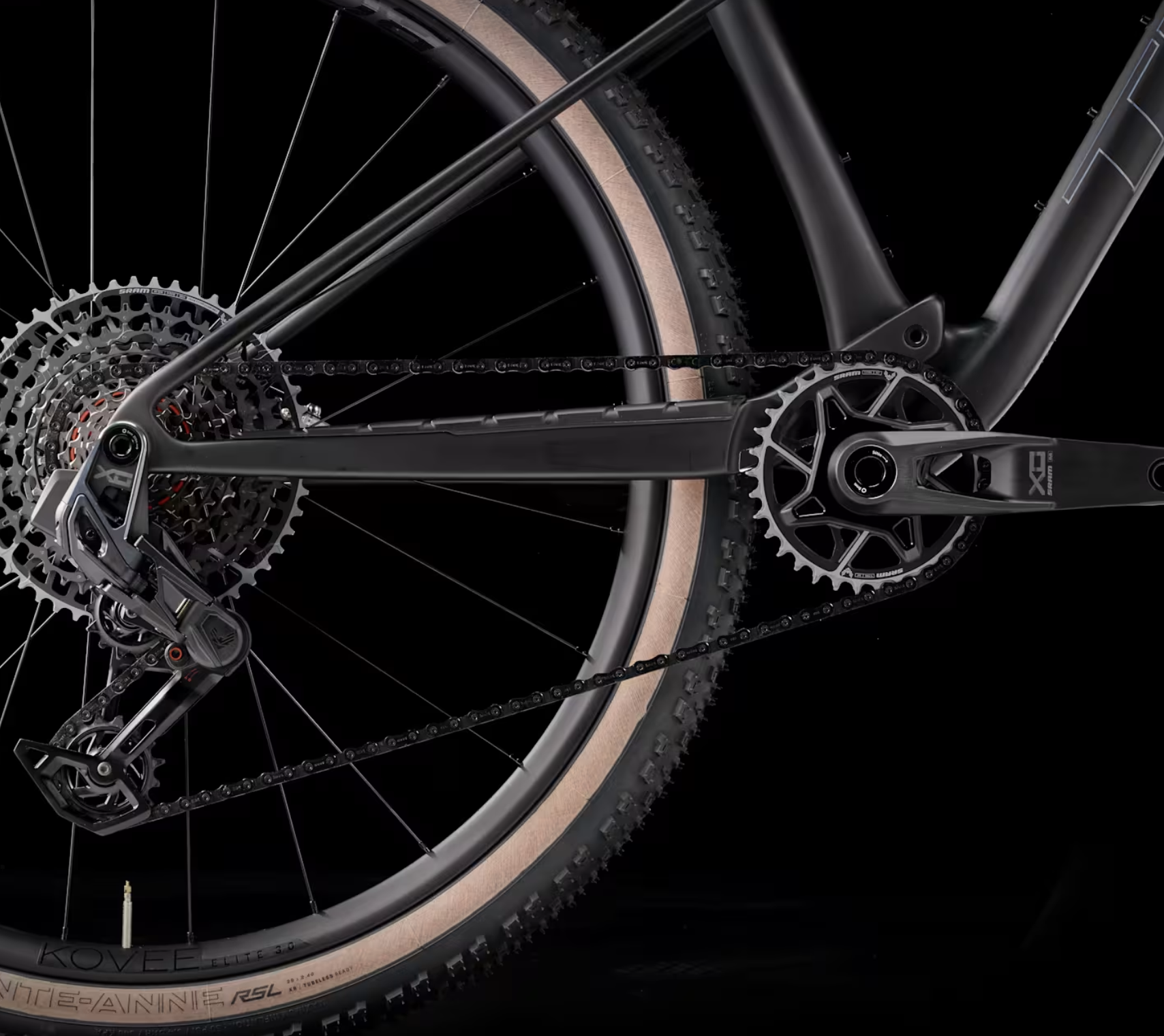 The Supercaliber SLR 9.8 XO AXS rolls on Bontrager Kovee Elite 30 OCLV Mountain Carbon wheels — a 30mm internal width, tubeless-ready carbon wheelset with Rapid Drive 108 engagement at the rear for near-instant power transfer the moment you begin pedalling. These are lightweight, stiff, and durable wheels that provide a genuinely noticeable performance advantage over alloy alternatives in terms of weight, stiffness, and ride quality.