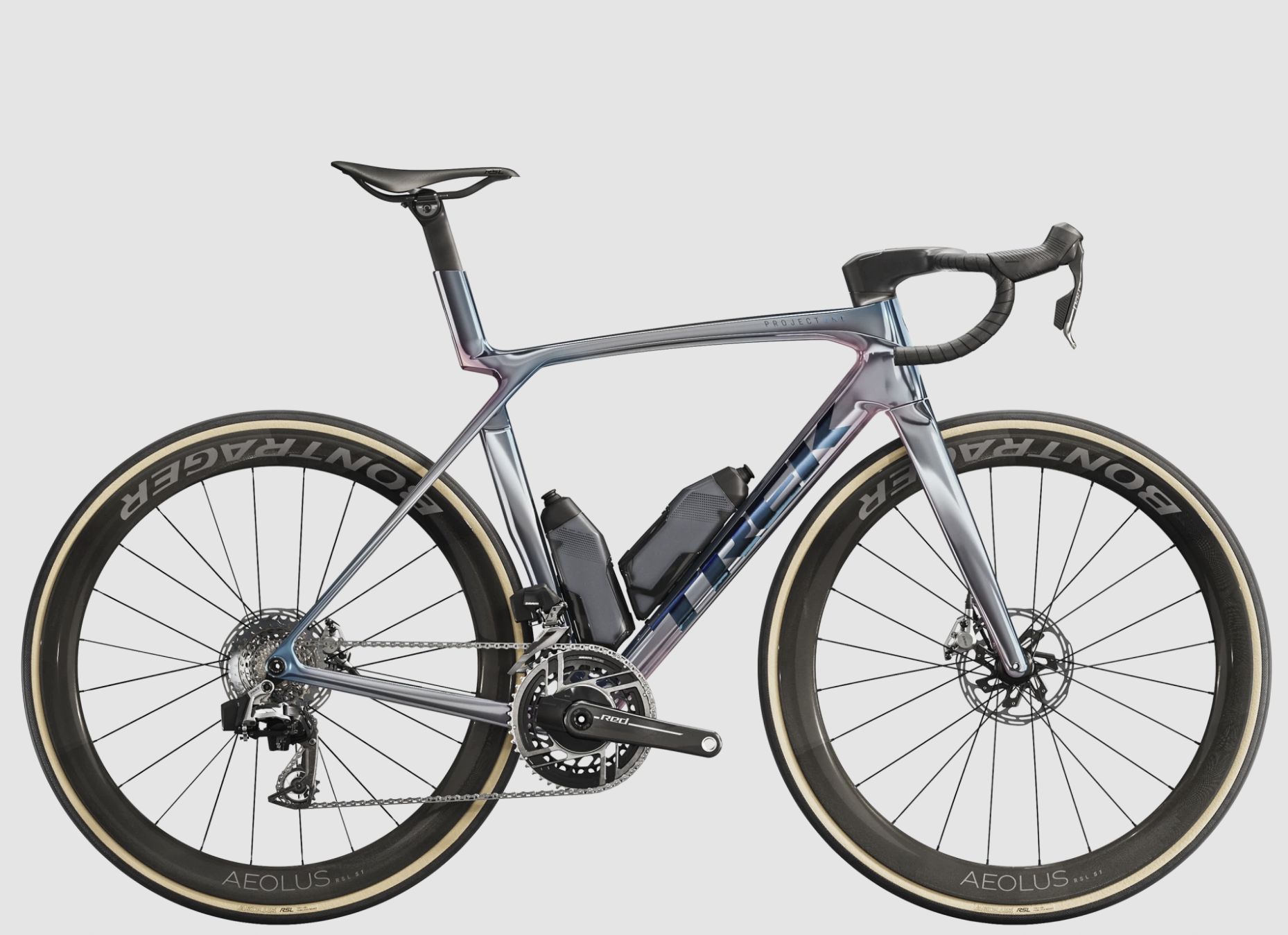 An insanely light frame made of our highest-level 900 Series OCLV Carbon with aero tubing, IsoFlow comfort technology and RSL Aero Bottles and Cages that save watts. SRAM’s latest RED AXS E1 ultra-light drivetrain and power meter for training with data. A universal derailleur hanger so you can get a replacement from anywhere. Plus, it’s topped off with Bontrager Aeolus RSL 51 tubeless carbon wheels and a Trek Aero RSL one-piece bar/stem.